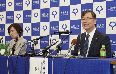 ノーベル生理学・医学賞の受賞が決まった坂口志文特任教授(74)=右=は7日、大阪府吹田市の大阪大で招聘(しょうへい)教員の妻教子さん(71)と記者会見した。 【時事通信社】