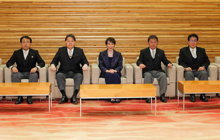 初閣議に臨む高市早苗首相(中央)と閣僚ら=21日午後、首相官邸 【時事通信社】