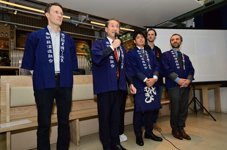 鳥取県の平井伸治知事はフランス・パリを訪れ、11~12日に県産の日本酒や民芸品のトップセールスを行った。写真は試飲会で、法被姿であいさつする平井氏(左から2人目)=11日撮影 【時事通信社】