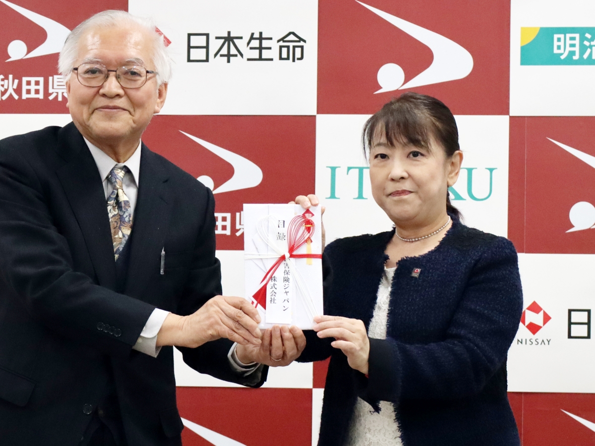 「あきたスギッチファンド」を通じて秋田市の市民活動団体に寄付金を贈呈する「損害保険ジャパン」の秋田支店長(右)