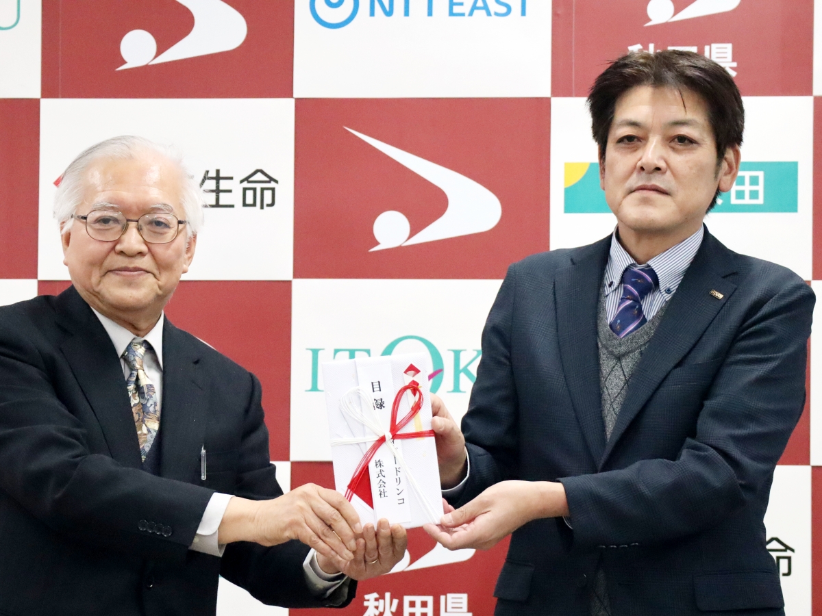 「あきたスギッチファンド」を通じて能代市の市民活動団体に寄付金を贈呈する「ダイドードリンコ」の東北営業本部長(右)