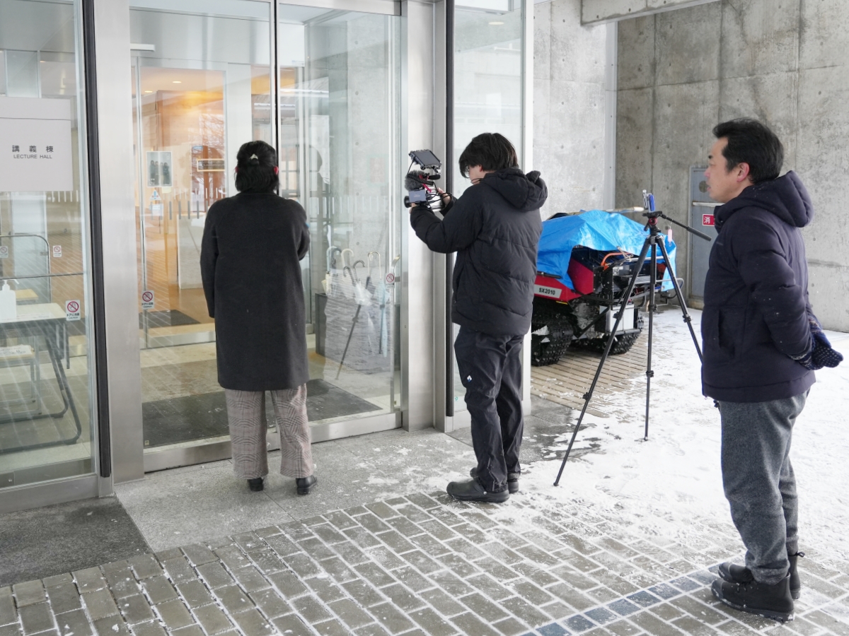 自動ドア開閉補助ツールの制作課題に取り組む秋田公立美術大学の学生