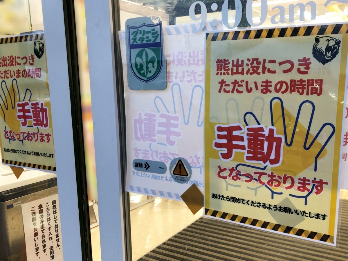 クマの侵入対策で電源が切られた自動ドア(秋田市内)