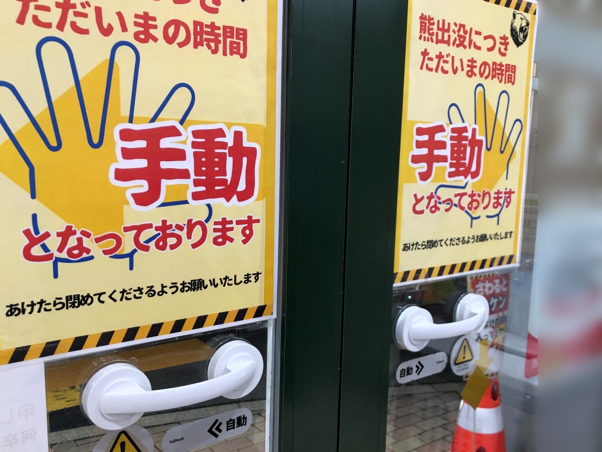 秋田市内で多く見られる自動ドアに仮設された手動開閉用「取っ手」