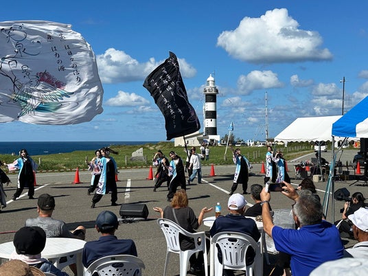 当日は天候にも恵まれ、絶好のイベント日和。11時からフェスがスタートすると会場MCのちぇすがユーモラスな掛け合いでステージを盛り上げました。12時からは灯台前で「なまはげ太鼓」の演舞もスタートし、迫力ある太鼓の音に会場も熱気に包まれていました。その後も、ちぇすの灯台にまつわるクイズや初登場となる「よさこい」のステージなど内容盛りだくさんで、会場を訪れたお客様を楽しませました。