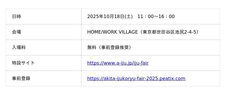 秋田県は、2025年10月18日(土)に、東京・世田谷区のHOME/WORK VILLAGEにて「あきた移住・交流フェア2025」を開催します。本イベントは、秋田への移住や地域との関わりに関心を持つ方々に向けて、秋田の魅力を“まるごと”体感できる一日。移住を検討していない方でも、マーケットや体験、ステージイベントなどを楽しみながら、自然と「秋田っていいな」と感じていただける内容となっています。