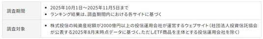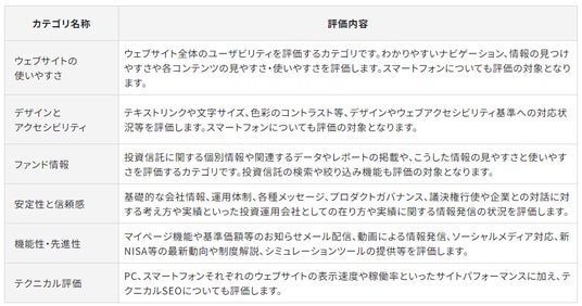 こうした社会的使命を踏まえ、資産運用会社には、運用力の強化や顧客本位のビジネス運営に加えて、説明責任、スチュワードシップ、サステナビリティ対応の高度化が求められています。これらの動向を踏まえ、本ランキングでは、従来のサイト全体のユーザビリティや商品情報の充実度に加え、プロダクトガバナンス体制、運用プロセスの透明性、運用責任者・チームの専門性、サステナビリティおよびフィデューシャリー・デューティーへの対応など、信頼性と説明責任の観点をより重視して評価しています。