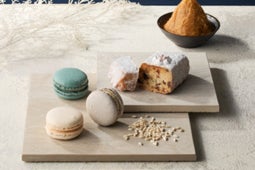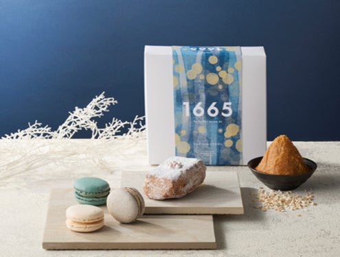 ナッツ類とドライフルーツをたっぷり入れ、自社製の甘酒と米こうじ味噌を加え、しっとり焼き上げた「1665」ブランドオリジナルのシュトーレン。3色のクラシックカラーのマカロンには、甘酒バニラクリームをサンドしました。米こうじが優しく香る「1665」オリジナルのクリームは、マカロンとの相性もよく、外側はサクッと、中はしっとりした食感に仕上げました。
