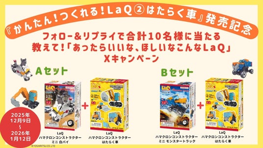 12月9日(火)から、最新刊『かんたん!つくれる!LaQ2.はたらく車』発売を記念したSNSキャンペーンがスタートします。奮って応募ください。