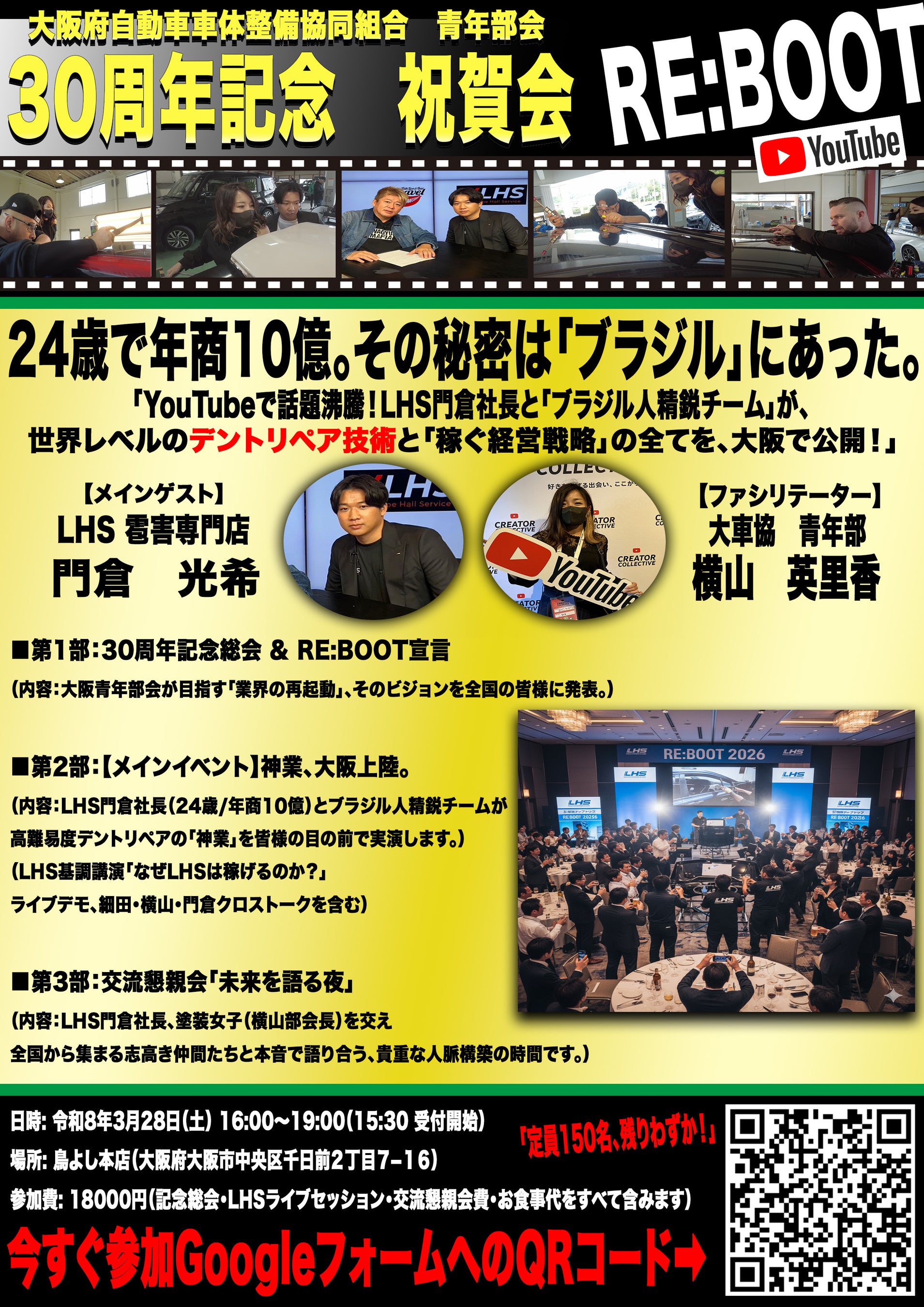 大阪府自動車車体整備協同組合 青年部会(所在地:大阪府大阪市、部会長:横山 英里香)は、2026年3月28日(土)、創立30周年記念事業として、業界の未来を再起動する決起イベント『RE:BOOT 2026 ~実利と未来を掴む、全国経営者・技術者の祭典~』を開催いたします。