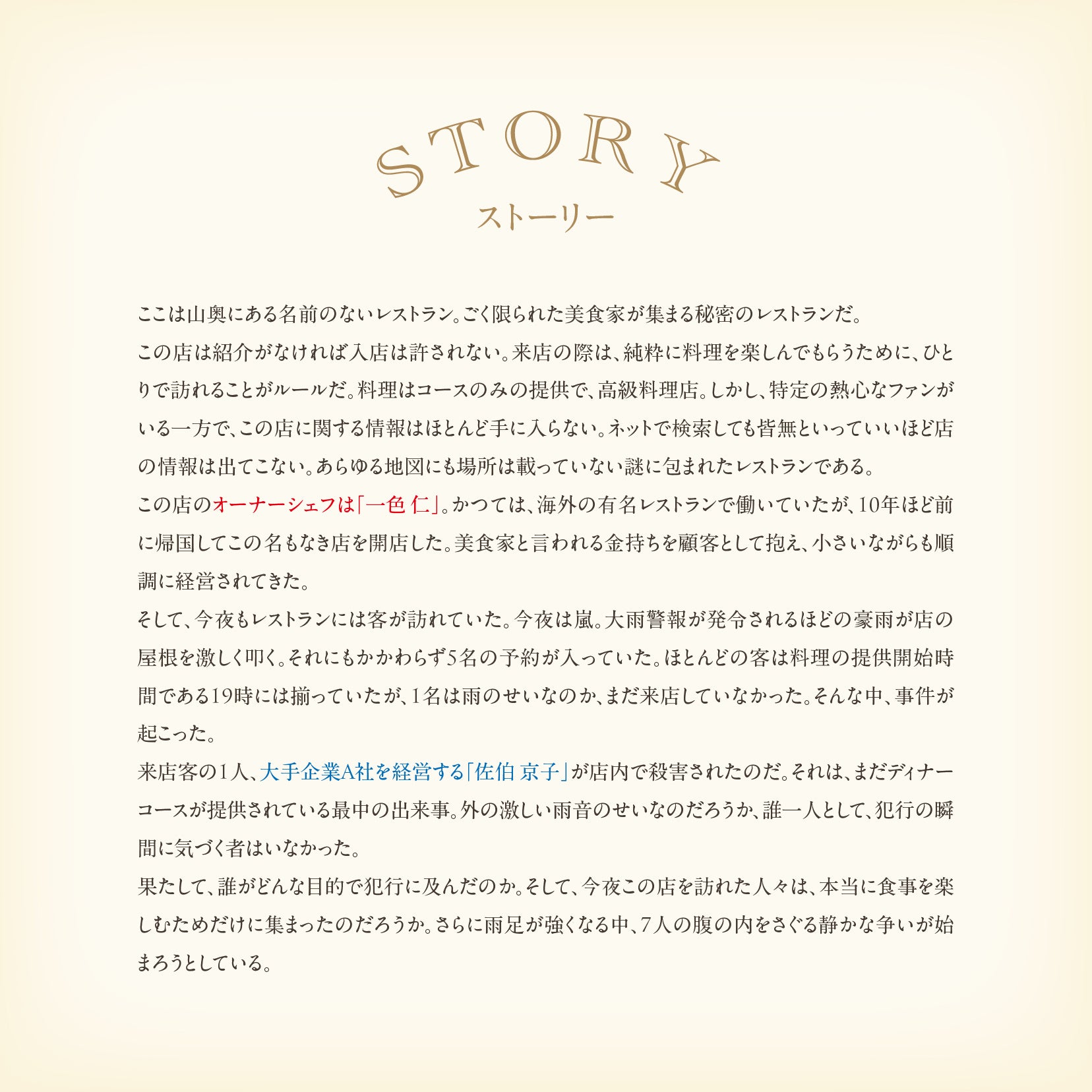 『名前のない洋食店』の舞台は、山奥に佇む秘密のレストラン。地図にも乗らない美食家のためのレストランで、一皿の料理が運ばれた瞬間に一人の客が命を落とす--。そこから物語が始まるクラシカルなミステリーです。