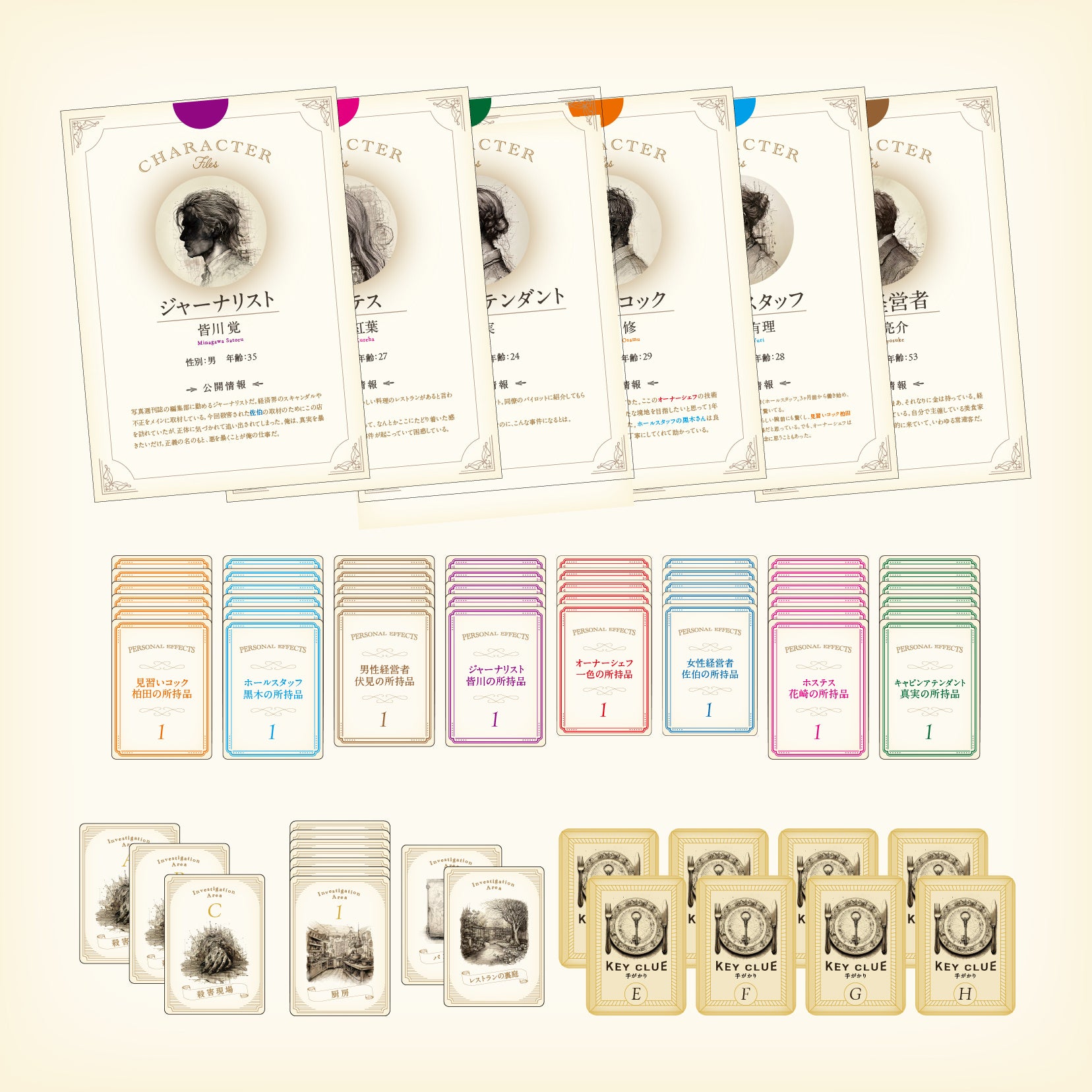 マダミスは、所要時間も定められています。本作品の所要時間は150分。映画を想像してもらうと分かりやすいかもしれませんが、ひとたびゲームが始まるとそこから時間とともにストーリーが動き出します。物語の中に入り込んだような没入感と他のプレイヤーとの心理戦がこのゲームの面白さですので、一人が退席すると、そこでストーリーが止まってしまうため、開催前に参加者同士で時間を確認してから始めましょう。