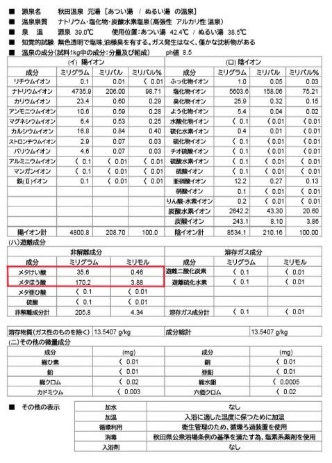 秋田温泉源泉は、pH8.5の弱アルカリ性、“とろみ”のある無色透明のナトリウム・塩化物・炭酸水素塩泉です。美容効果が期待され、メタケイ酸やメタホウ酸も含まれており、肌を健やかに保ちます。