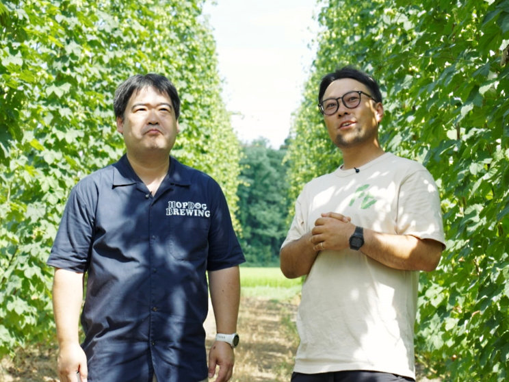 長谷川信さん(左)とホップを生産する横手市の小棚木裕也さん(右)